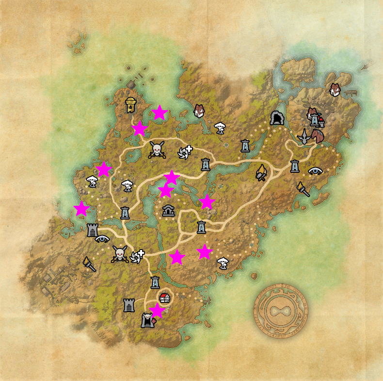 | Ayleid Blacksmithing Station (1/5) | West Weald | Delve Boss, West Weald, Fyrelight Cave (Scourgetail) | Wildsmith Anointing Decoction | Furnishing Fragment |